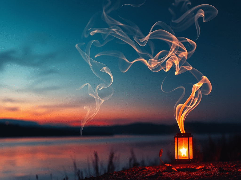 I light a small lantern by the riverbank at dusk, watching the smoke spiral into the twilight sky. Each curl twists differently, folding back on itself, merging with the evening air. The motion is quiet yet alive, carrying warmth and intention forward while echoing the flicker of flame that birthed it.