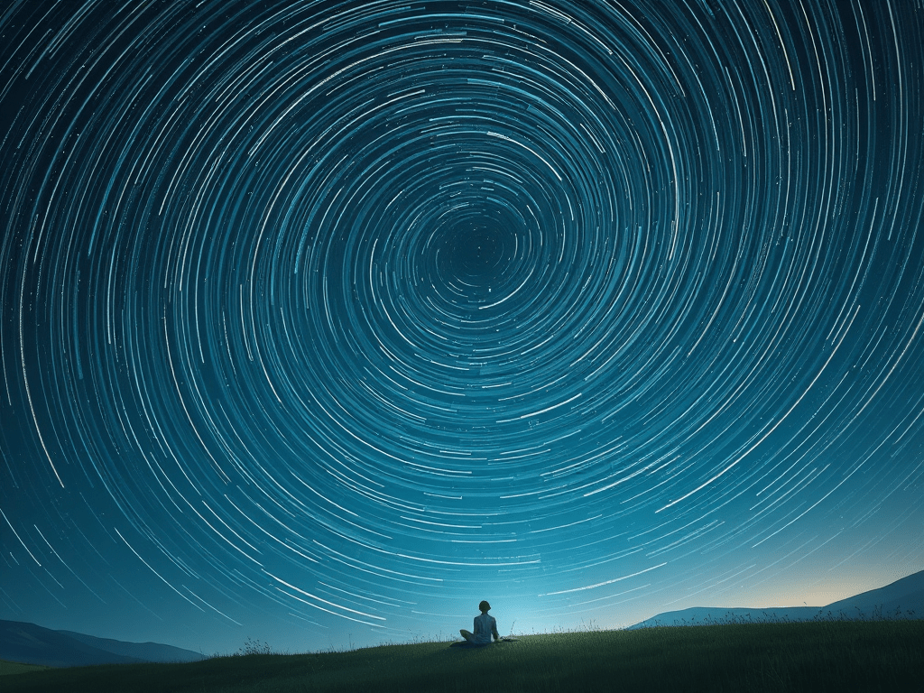 I lie on the ground beneath a clear sky, tracing spirals of light with my eyes. Each trail carries the history of cosmic motion, billions of years folded into arcs visible in a single night. I feel myself fold into their rhythm, sensing a connection to something infinite.